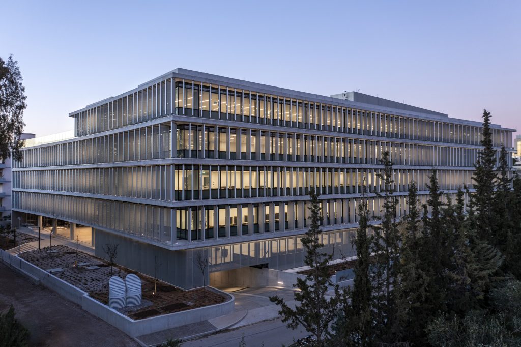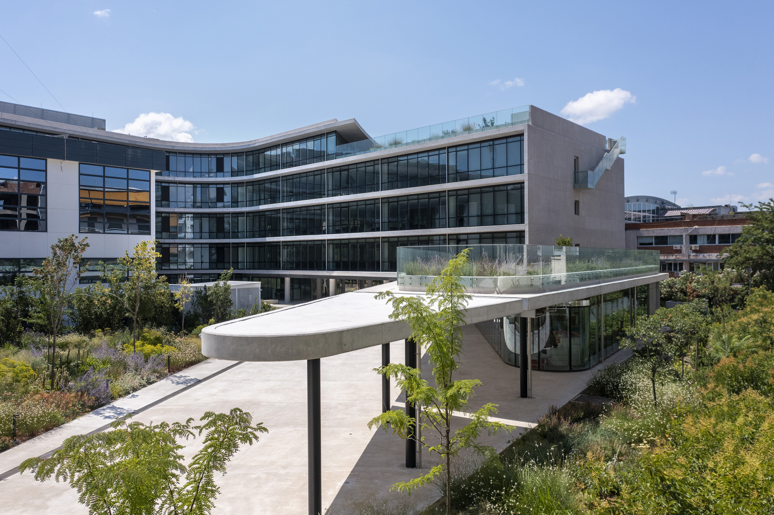 The name says it all: the newly constructed eLement office building is shaped like an L on the almost square plot in the Marousi district in the northern suburbs of Athens. An existing building in the centre of the site made the L-shape the only practical solution. It was therefore already specified in the competition, which the architect Rena Sakellaridou won with her dynamic design.